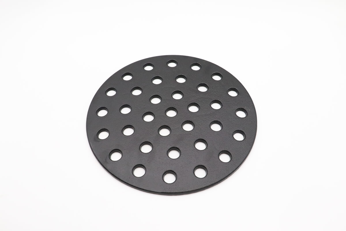 La grille à charbon de bois en fonte se trouve au fond de la boîte à feu en céramique du Kamado. Les braises reposent sur la grille à charbon de bois. Les trous de la grille assurent une bonne circulation de l’air.